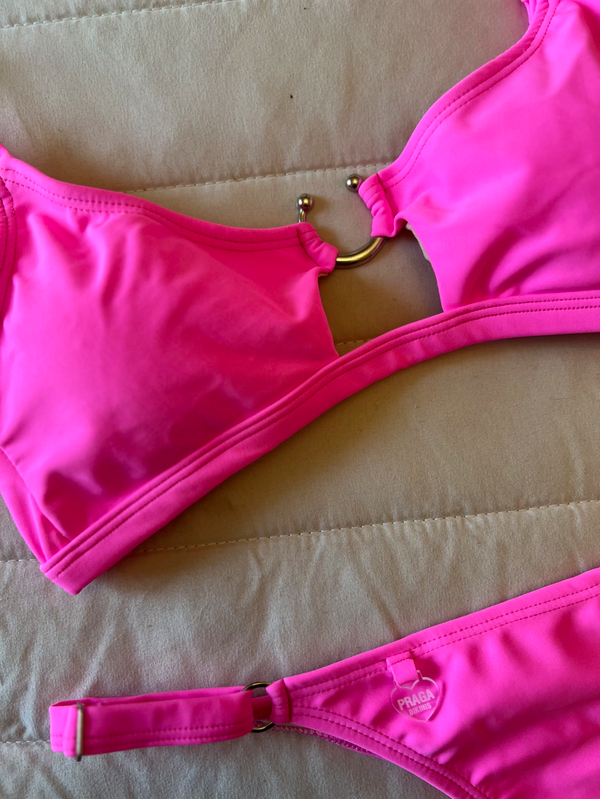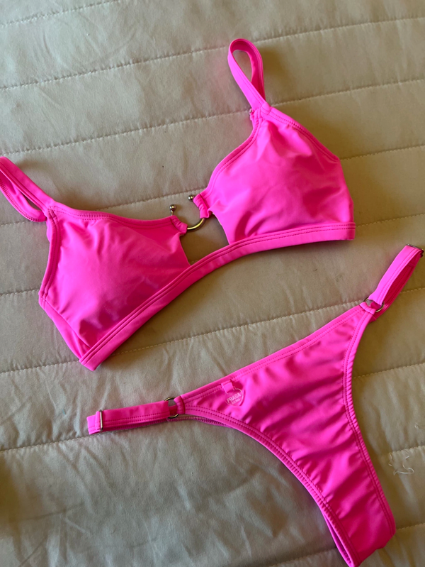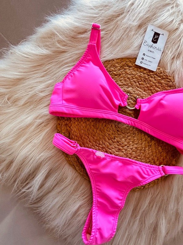Bikini con aro en medio. Viene con less y breteles regulables. En espalda es para atar. Incluyen tazas desmontables. Calidad premium. Resistente a cloro y rayos UV.