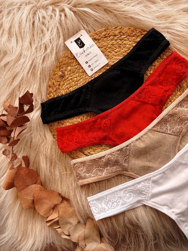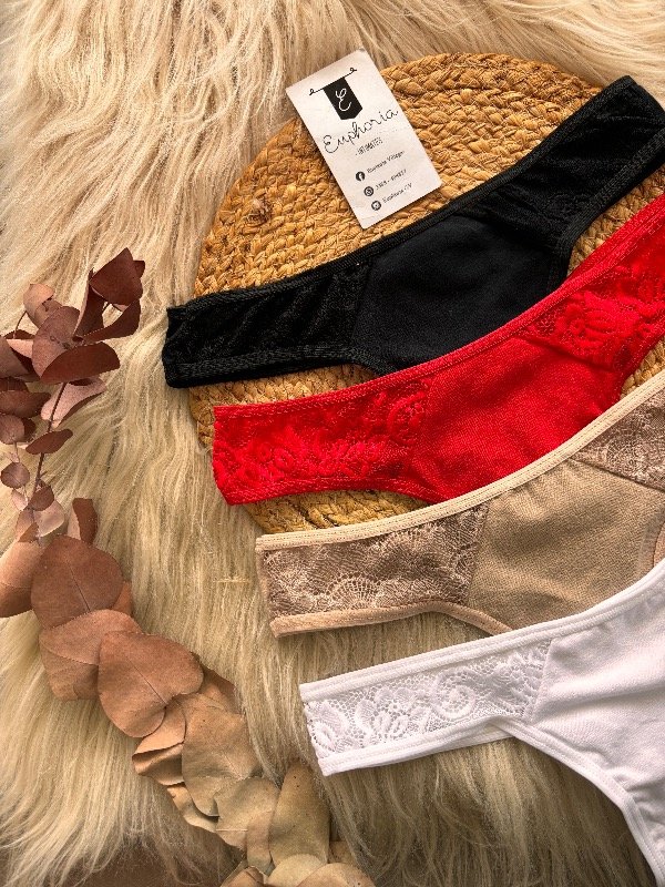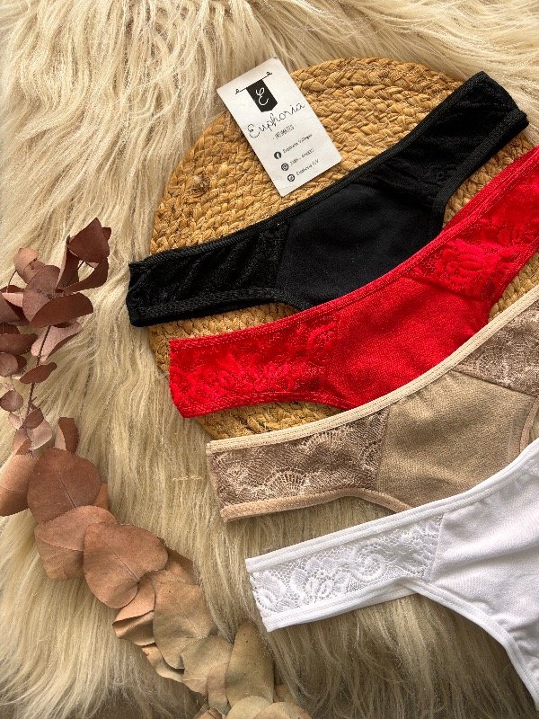 Less de algodón clásicas combinadas con encaje en laterales, pack por 4 unidades. Color: Blanco, Negro, Nude y Rojo.