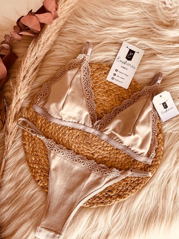 Conjunto sin taza ni aro, de algodón, con detalle de borde con puntilla. Viene con less regulable en combinación.