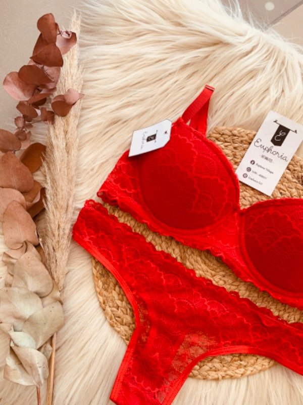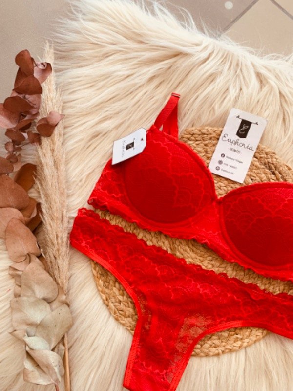 Conjunto de encaje, taza Soft con aro, viene con less de encaje en combinación, no regulable. Color rojo.